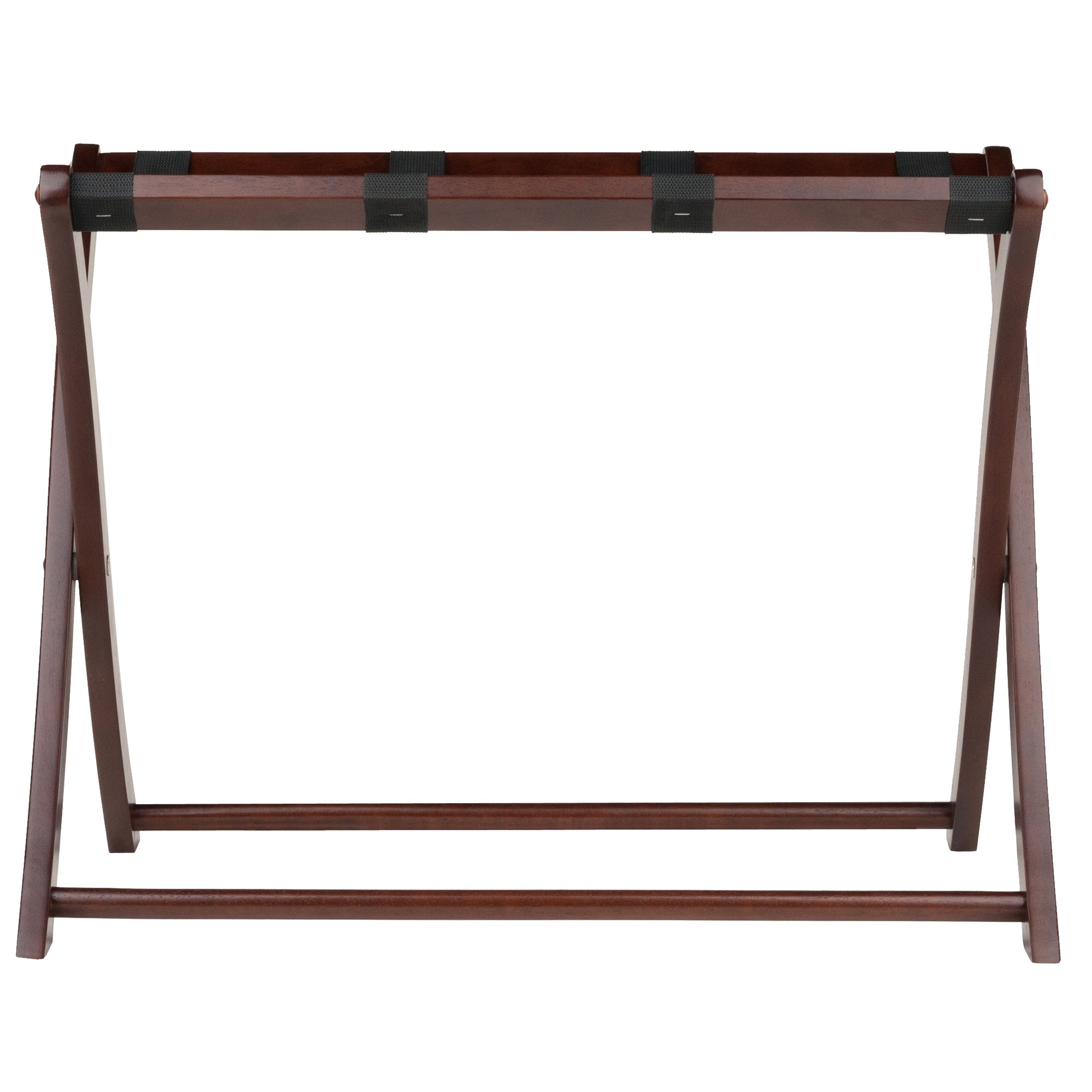 Overnight guests will thank you for putting out the Scarlett Luggage Rack, where they can set their luggage and unpack. Made of solid wood in a rich cappuccino finish with thick, sturdy black straps, the rack will hold a heavy suitcase. The curved-leg frame folds easily when not in use.