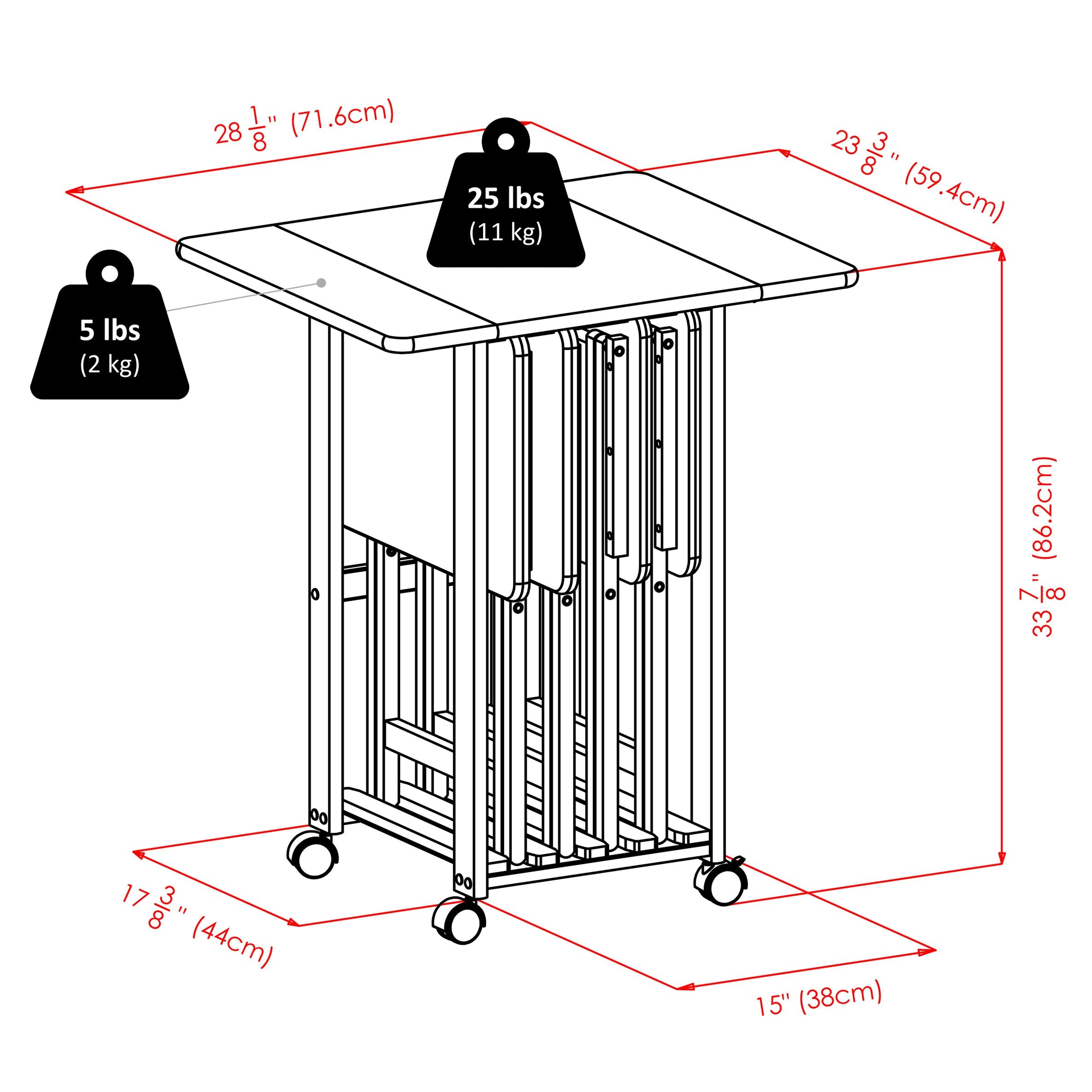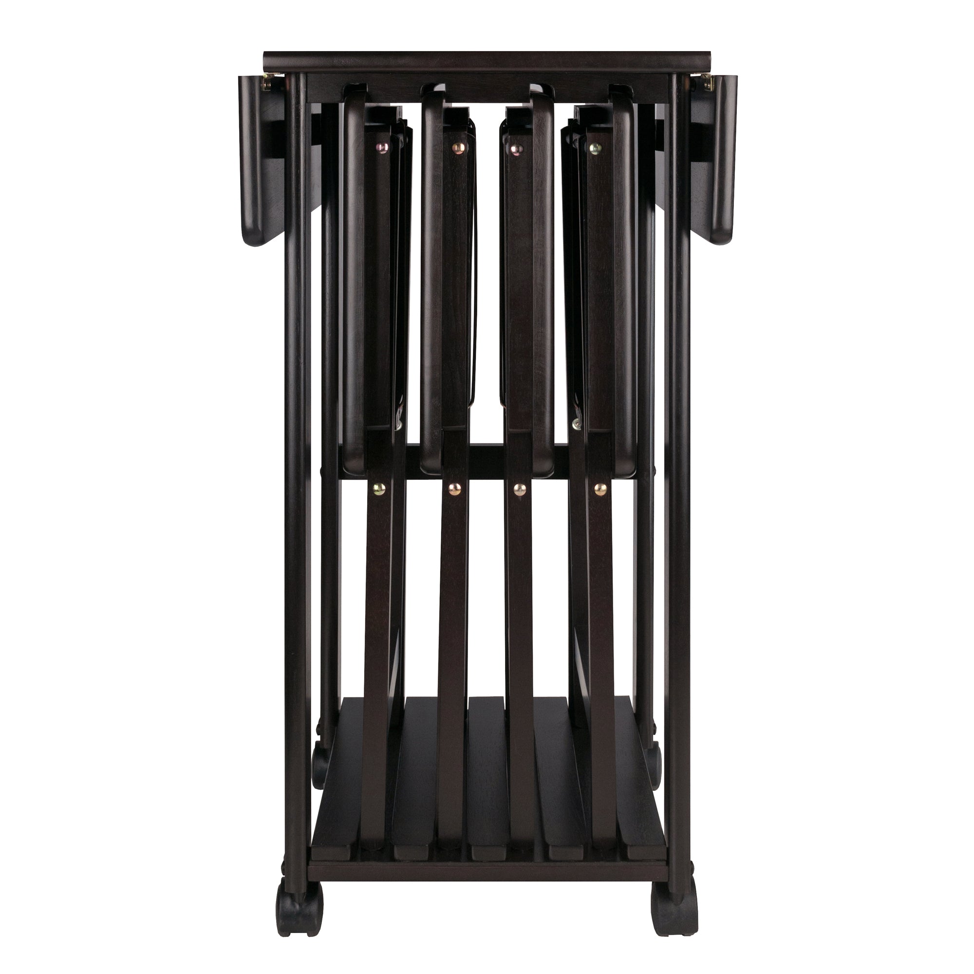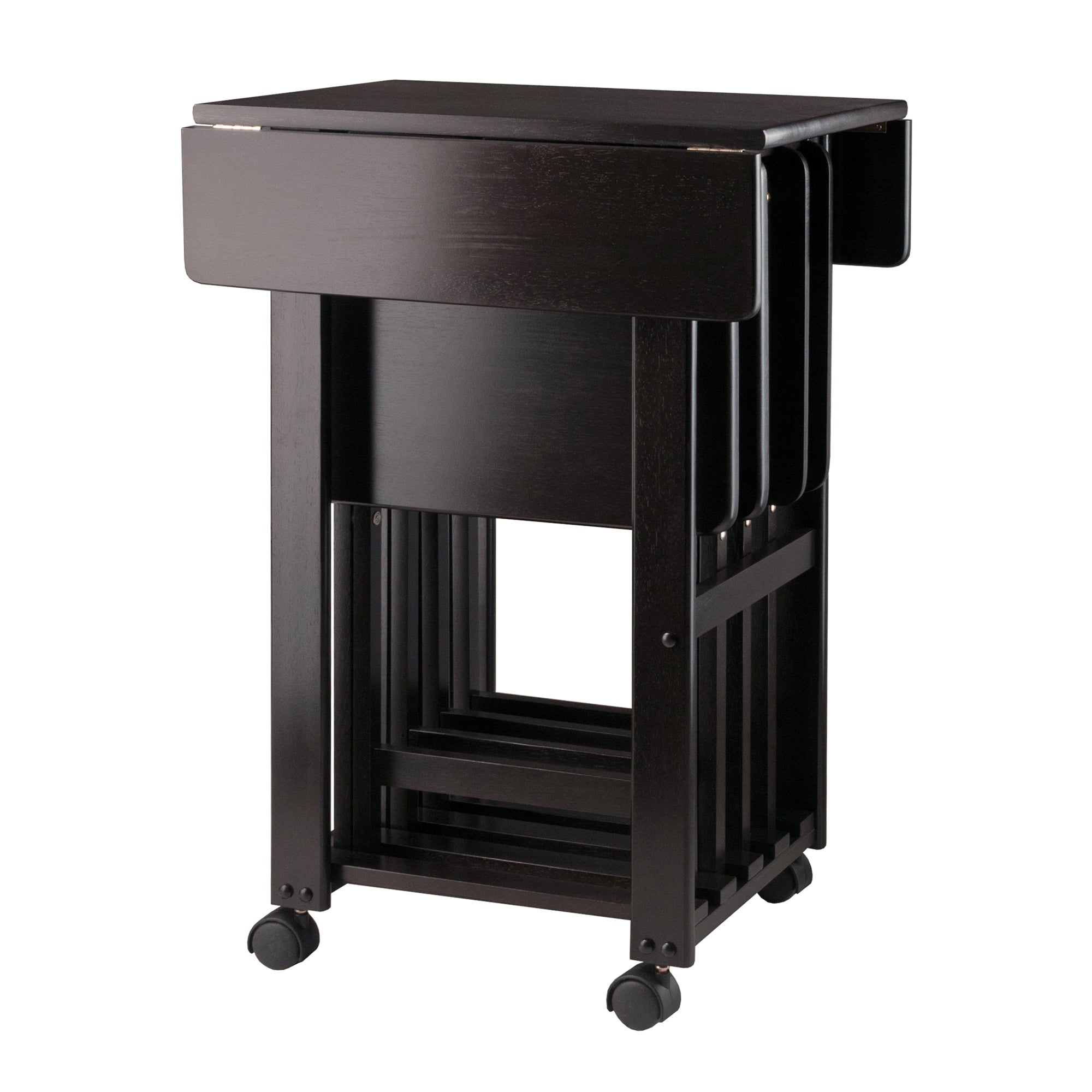 Convenience along with ample table space is the hallmark of the Sofia 5-piece Snack Tray Set. Four folding snack tables store neatly in a double drop-leaf table that can expand to over 28" wide and transports easily on rolling casters. Open the table for serveware, drinks, and glasses and still provide guests or family with an individual snack table. Made of solid and composite wood in a rich coffee finish.