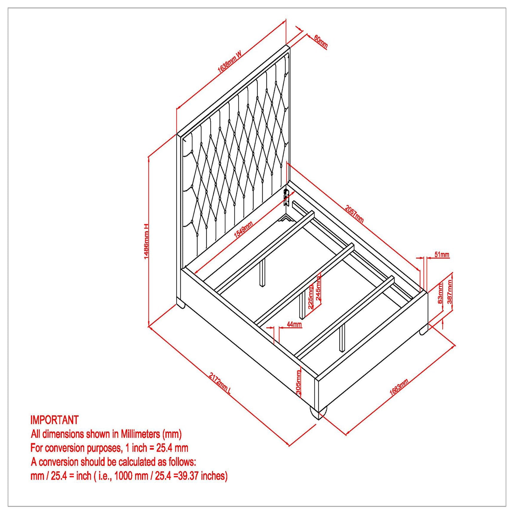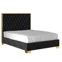 - Diamond patterned button tufting on headboard with polished stainless steel frame