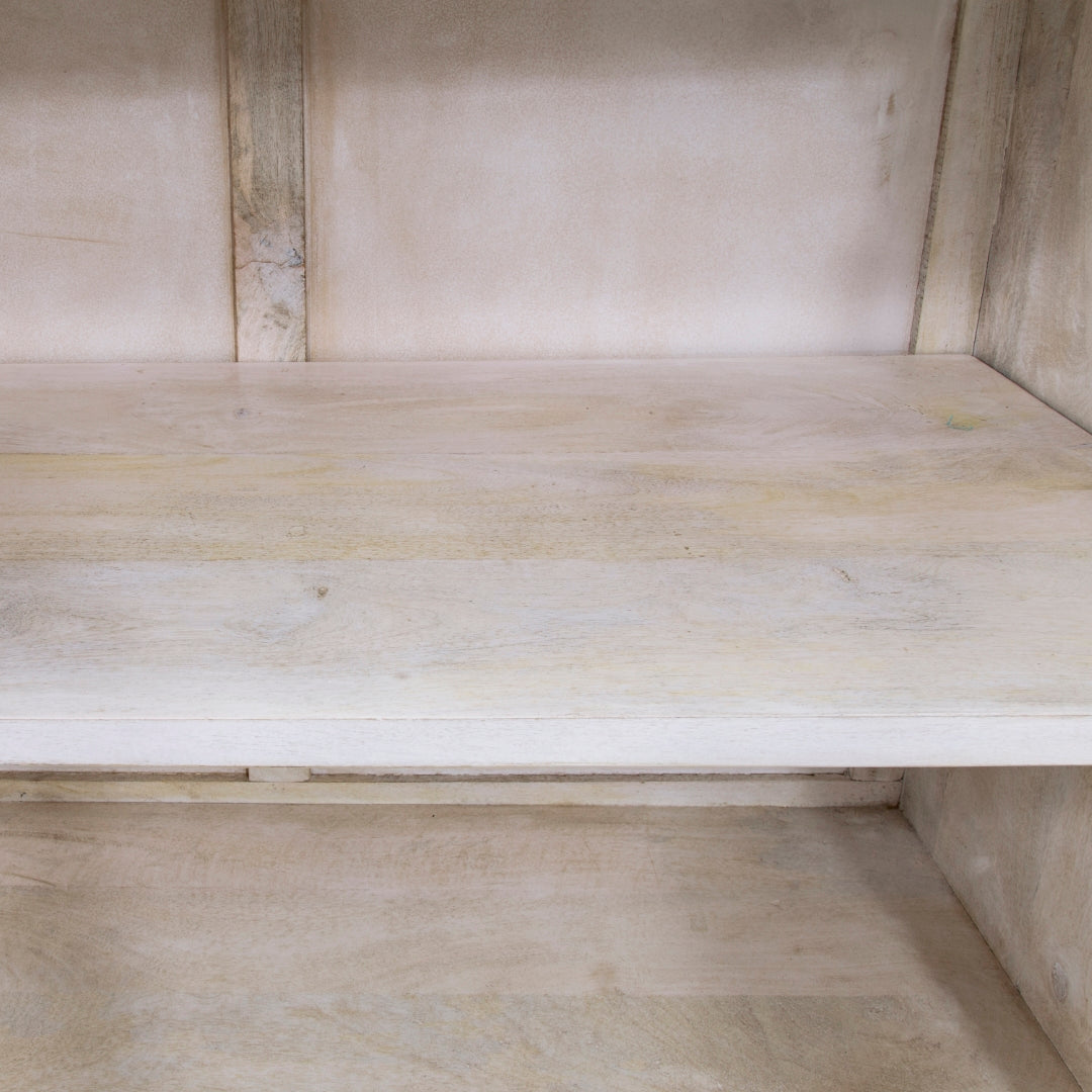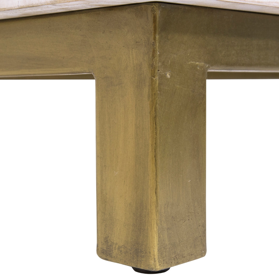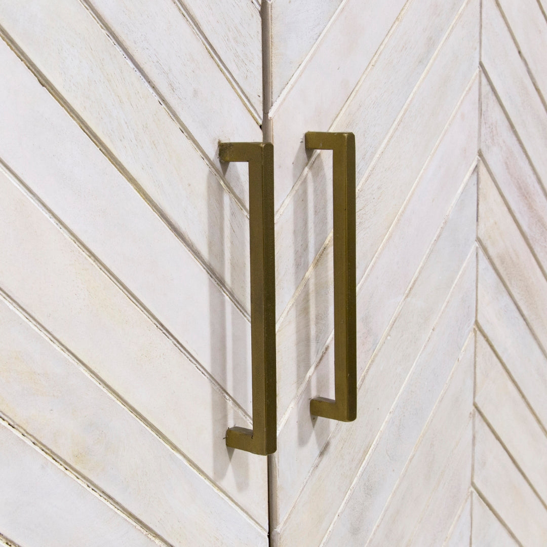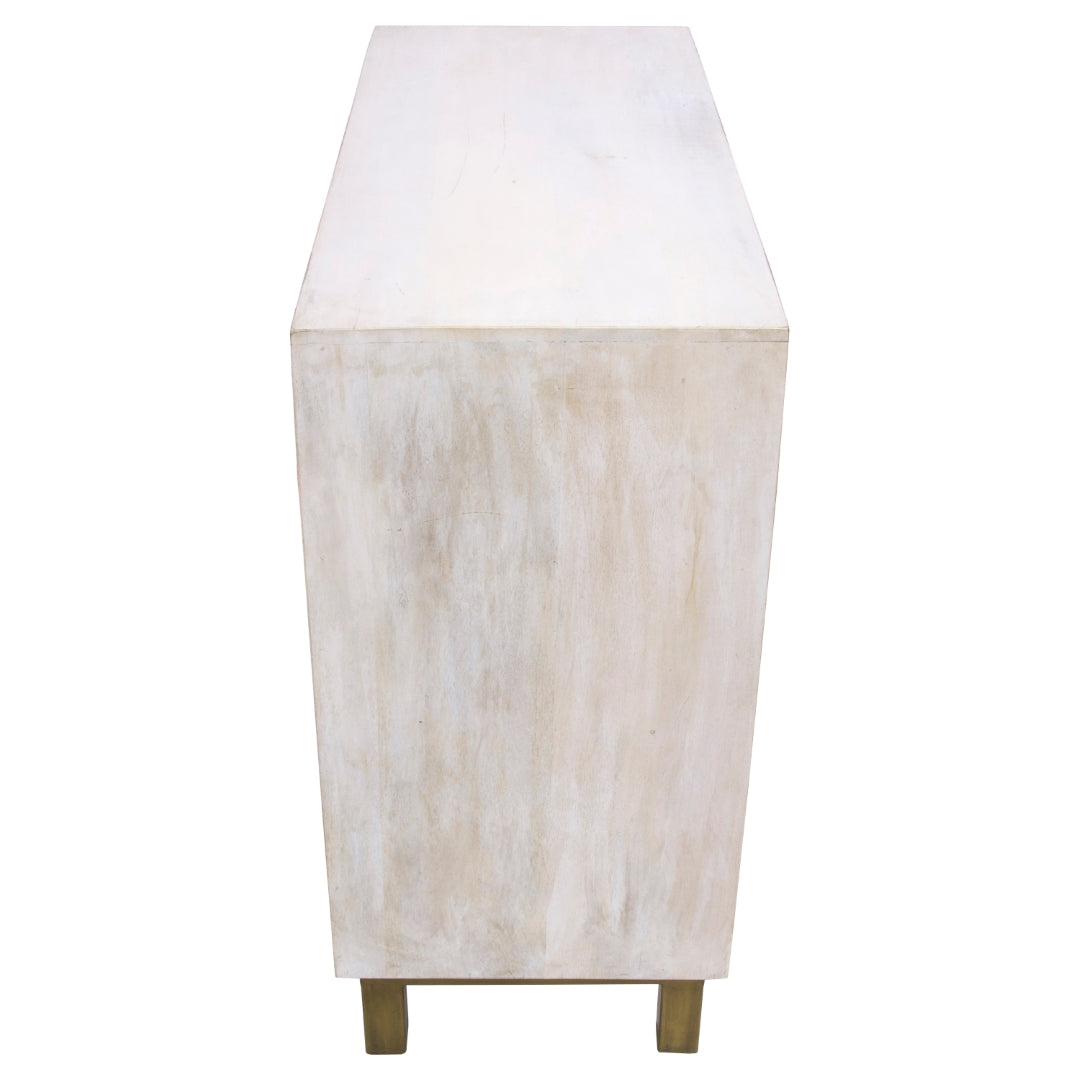 - Feature 4: Lime Wash Finish With Antique Brass Metallic Hardware & Base