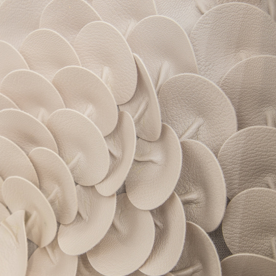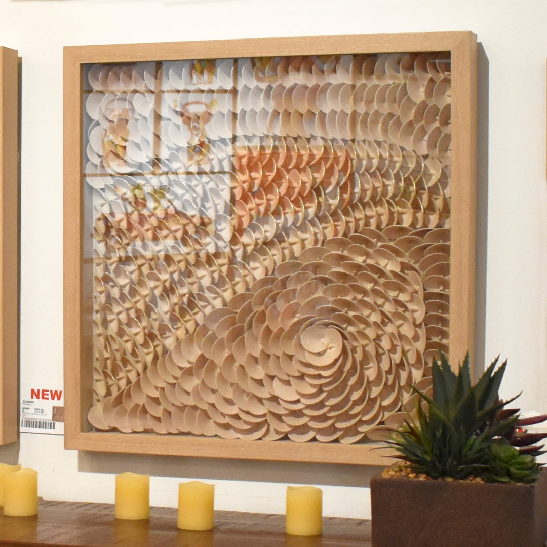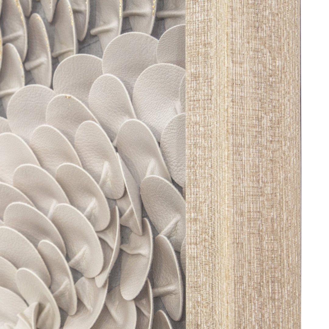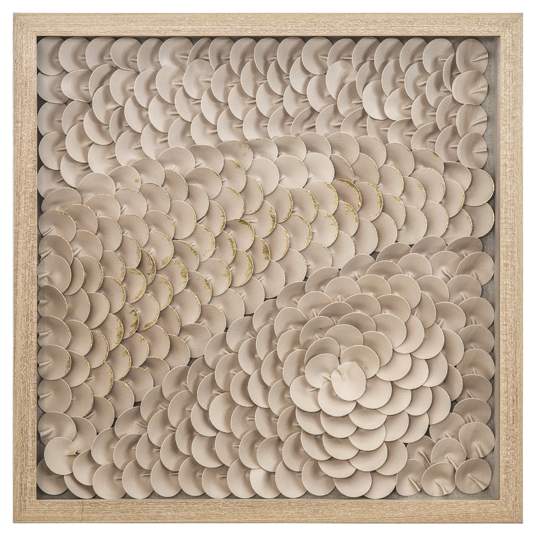 - Feature #1: Laeather Pettals Are Layered Into Abstract Pappern. Edges Of Some Of The Pettels Are Accented With Golden Paint. Framed And Covered With Glass.