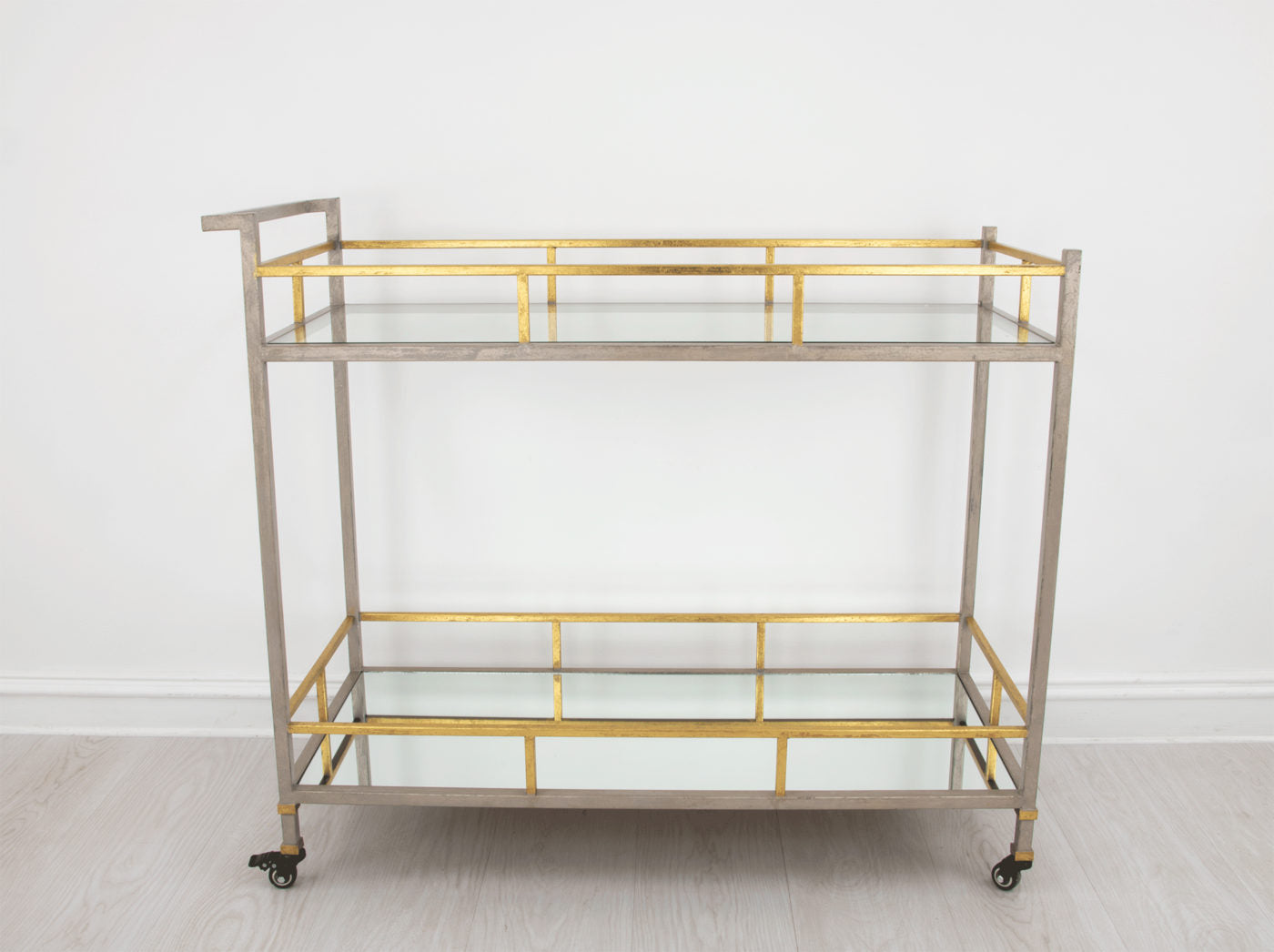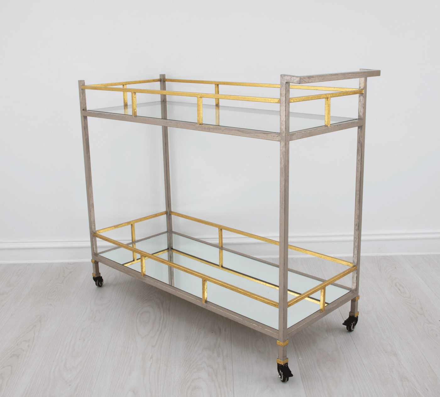 Serve meals and drinks fashionably with this lovely serving cart. It pairs perfectly with clear tempered glass top and mirror bottom for a look of refined sophistication. Two tiers easily accommodate trays and entrees, while wheels and a metal handle make it simple to move this dainty design from one place to the next.