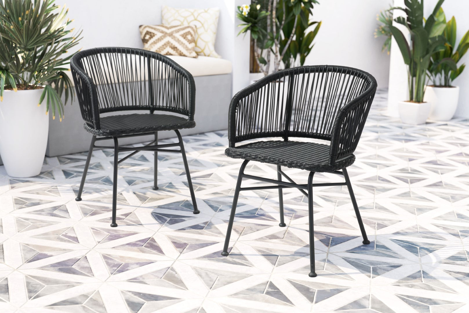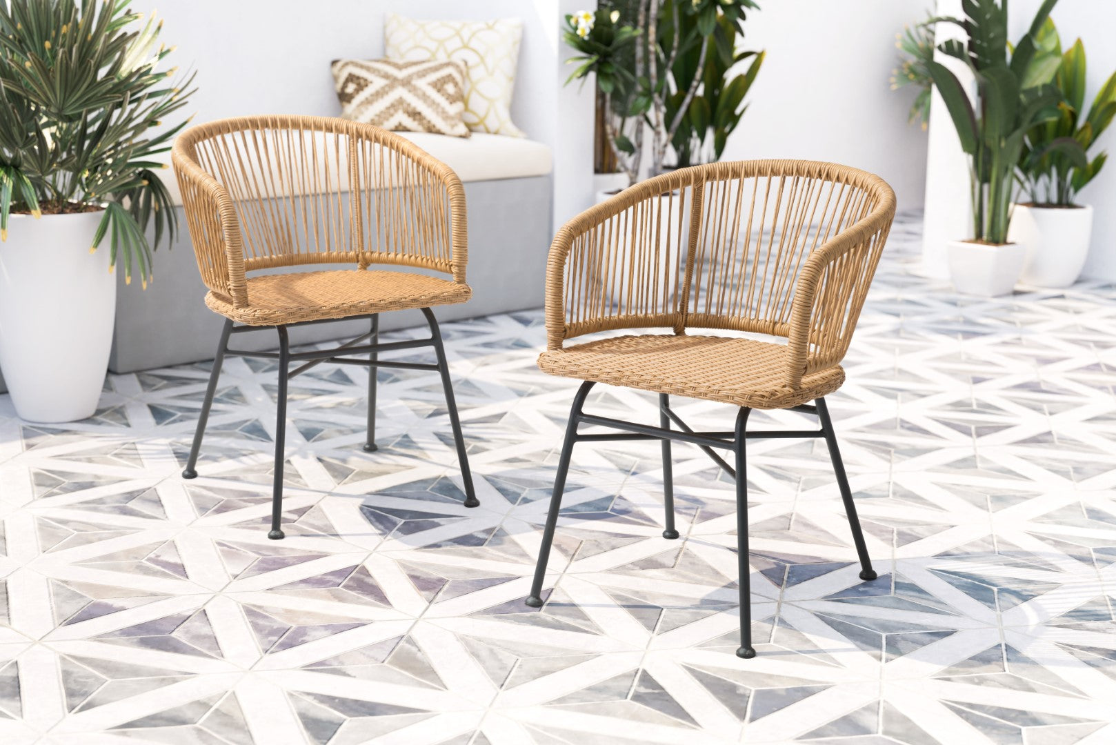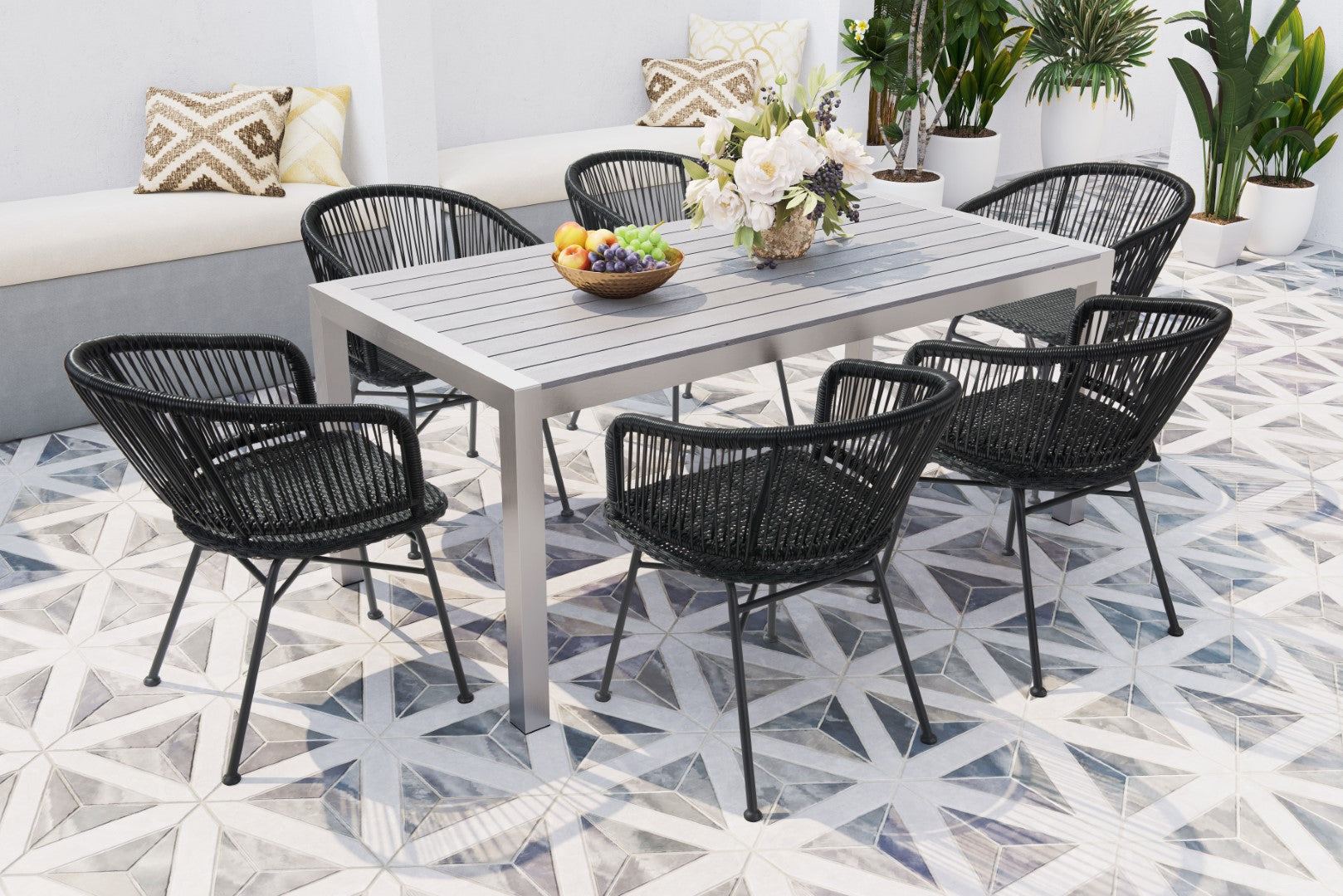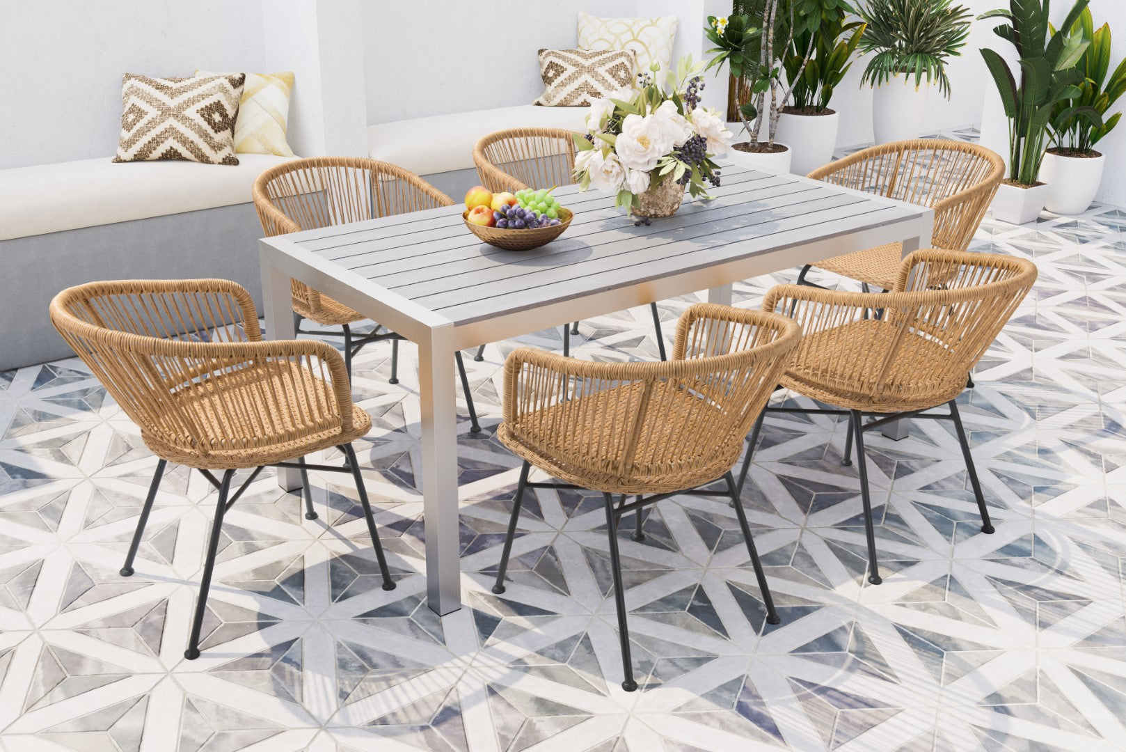 - Product Finishes + Materials (Combined): Powder Coated Steel, Synthetic Rattan Weave Polyethylene